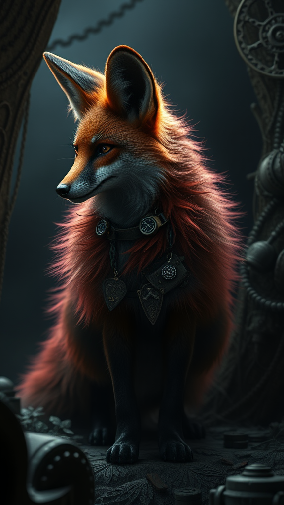 A majestic steampunk fox with a deep crimson coat stands elegantly, shrouded in atmospheric gothic horror; the scene resonates with Lovecraftian undertones, captured in the style of Midjourney, utilizing the prowess of a high-tech unreal engine. The fox is nestled in an environment wrought with hyper details and intricate textures, cast in very dark, moody lighting and enveloped by heavy shadows. The wide-angle perspective lends expansiveness to the digital masterpiece, presenting a visual feast akin to a realistic painting that lures one into a DND-inspired fantasy. Bathed in soft natural lighting punctuated by dramatic beams, the scene captures the depth of magic photography, reflecting a photorealistic vision with excessive detailing. Every fur strand and gear shimmers with artstation-quality finesse. The composition's smooth yet sharp focus, coupled with cinematic volumetric lighting, evokes a surreal, otherworldly feel, bridging the realms of concept art and photorealism, employing ray tracing to achieve hyper-detailed textures and light interplay.