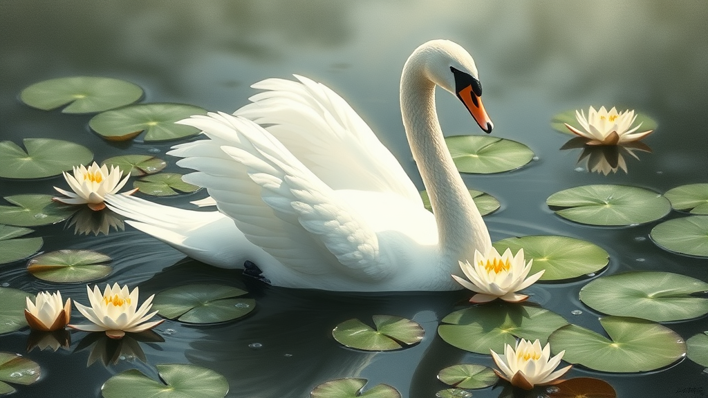 A majestic swan with pristine white feathers gliding gently among artfully detailed lily pads adorned with serene water droplets, set against a tranquil pond backdrop, embodying Karma as a symbol of grace. The scene is illustrated in the style reminiscent of Paul Catherall, with a 1200x800 resolution to capture a sense of ethereal serenity and beauty. Executed in an ethereal Charcoal Art style, this depiction embraces the theme of Water Serenity, infusing a subtle luminosity to enhance the tranquil atmosphere.