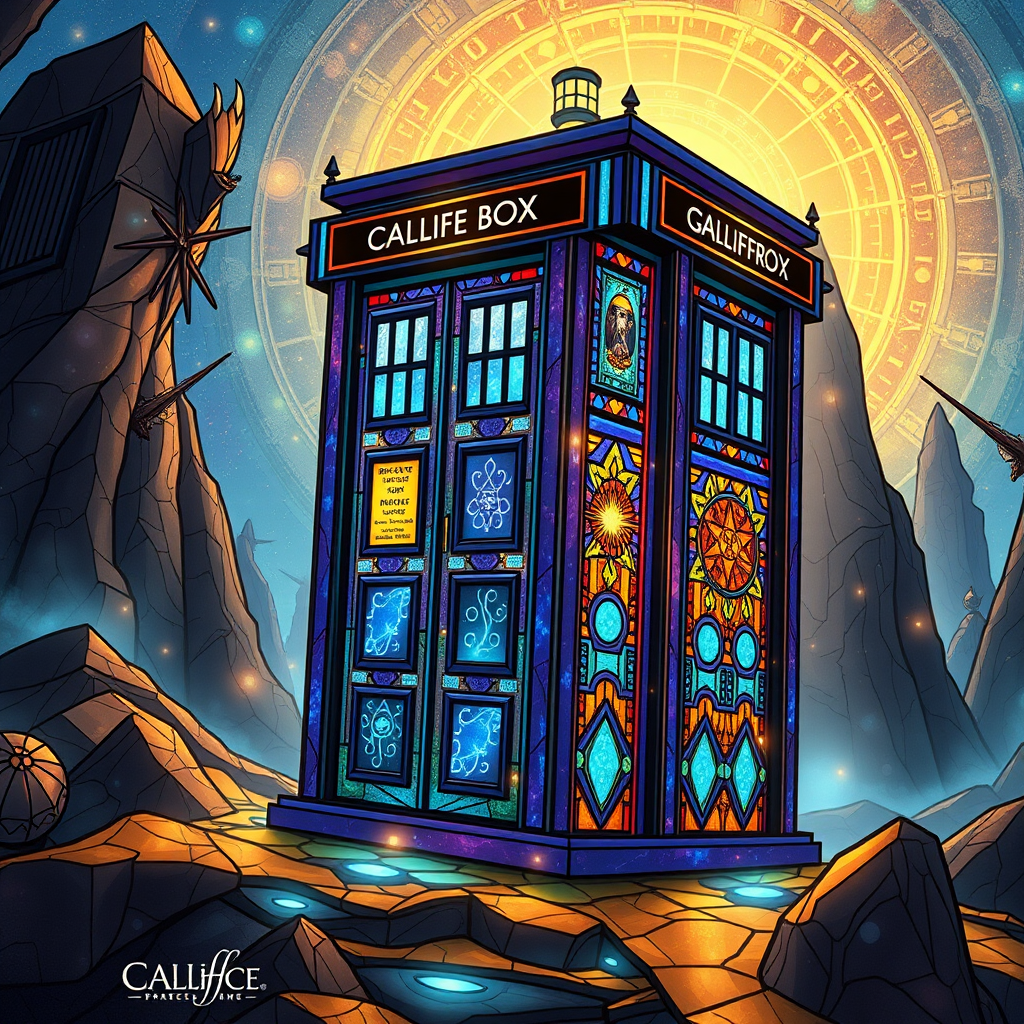 A majestic Tardis, crafted in the exquisite style of stained glass, showcasing intricate detail and vibrant colors, set against the backdrop of Gallifrey. The structure gleams with sparkling reflections, capturing the essence of Dr. Who's universe. The scene is hyper-detailed, with swirling patterns of celestial energy, and Gallifreyan symbols subtly woven into the design. Surrounding the Tardis, ethereal light dances, casting enchanting patterns across the landscape, blending the mystical with the mechanical.
