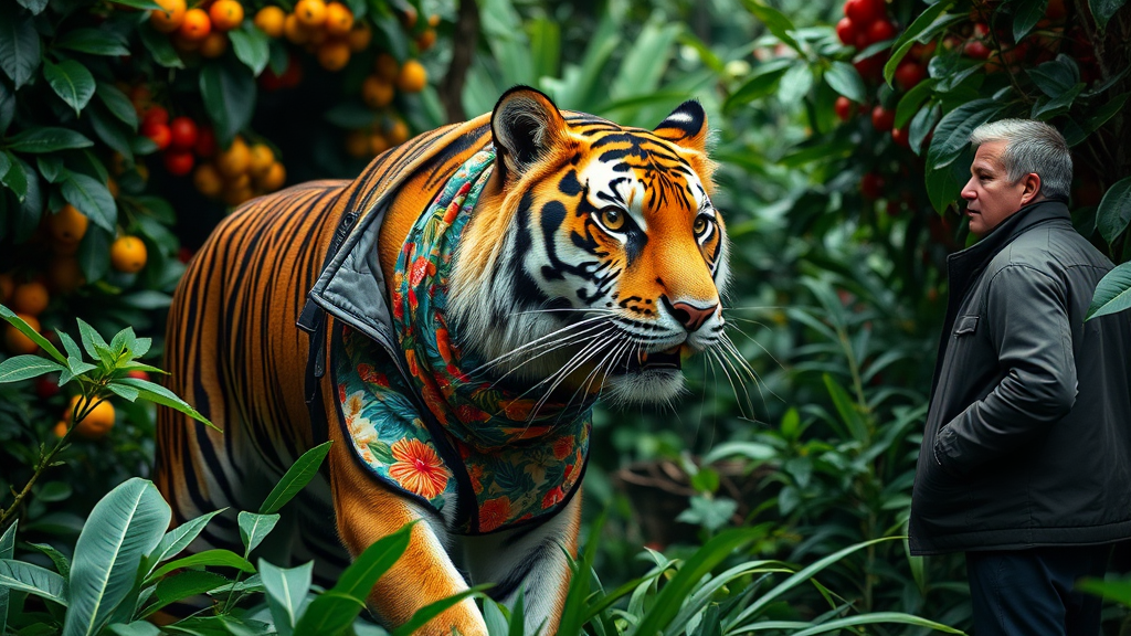 A majestic tiger donning a stylish jacket, a cozy scarf, and a vibrant Hawaiian floral shirt prowls through a lush jungle, surrounded by verdant plants and leaves. Nearby, a man in a jacket stands, capturing this moment reminiscent of Christian W. Staudinger's animal photography. It's an album cover vision brought to life with maximalist flair and a touch of L. Frank Baum's whimsical style. The scene features a fruit-laden background in a wide, panoramic frame, shot with a cinematic 16mm camera. The image is color graded to evoke the classic tones of Portra 400 film, highlighting the tiger's ultra-realistic textured fur and remarkably detailed eyes. Subtle skin fuzz and dry texture on the tiger add to its realism, while the setting's vivid hues amplify the remarkable color detail. This raw, candid cinematic scene combines a touch of fking_scifi with the charm of a classic film aesthetic.