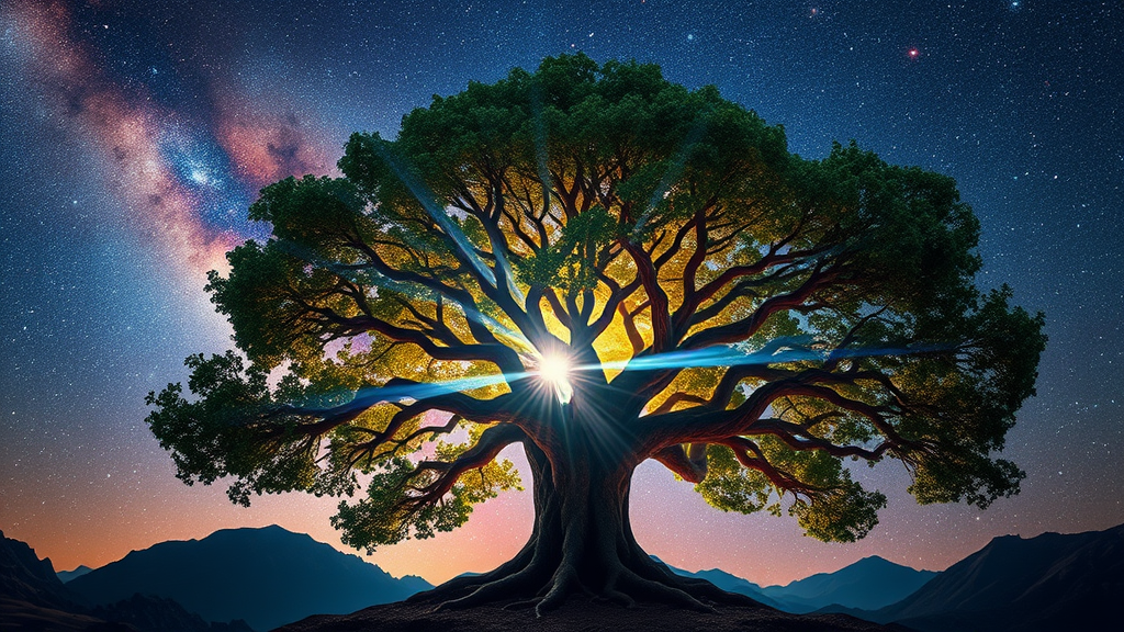 A majestic Tree of Creation, its leafy branches radiating vibrant streams of light against an awe-inspiring galactic sky, with expert color grading, gentle shadows, minimal contrast, crystal clarity, cinema-quality film photography, 32k resolution, hyper-realistic details. A stunning nebula serves as the backdrop, captured through a wide-angle lens with seamless focus, emphasizing the grandeur of the scene. The composition is devoid of mountainous elements, allowing the celestial wonders to take center stage.