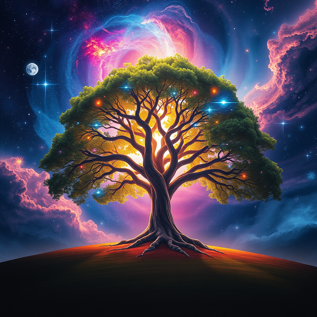 A majestic Tree of Creation stands at the heart of an energetic cosmic realm, its leafy branches intertwined with vibrant and colorful streams of light that dance across an epic galactic sky. The celestial backdrop is awash with swirling nebulae, each hue carefully graded to perfection, exuding a sense of boundless wonder. The scene is captured with a wide-angle lens, offering a hyper-realistic, cinema-quality view that is both clean and sharply focused. Subtle, soft shadows play across the serene landscape, enhancing the depth and beauty of this cosmic birth. There are no mountains to disrupt the fluidity and grandeur of this otherworldly scenery.