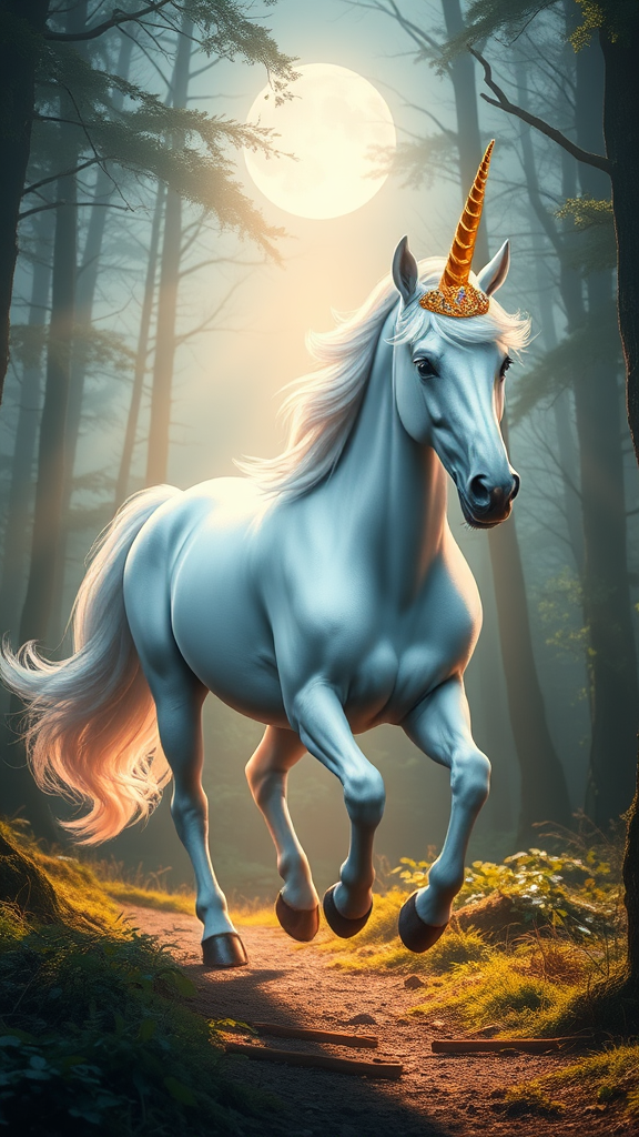 A majestic unicorn crowned with a shimmering golden tiara gracefully prances through an ethereal forest bathed in moonlight.
