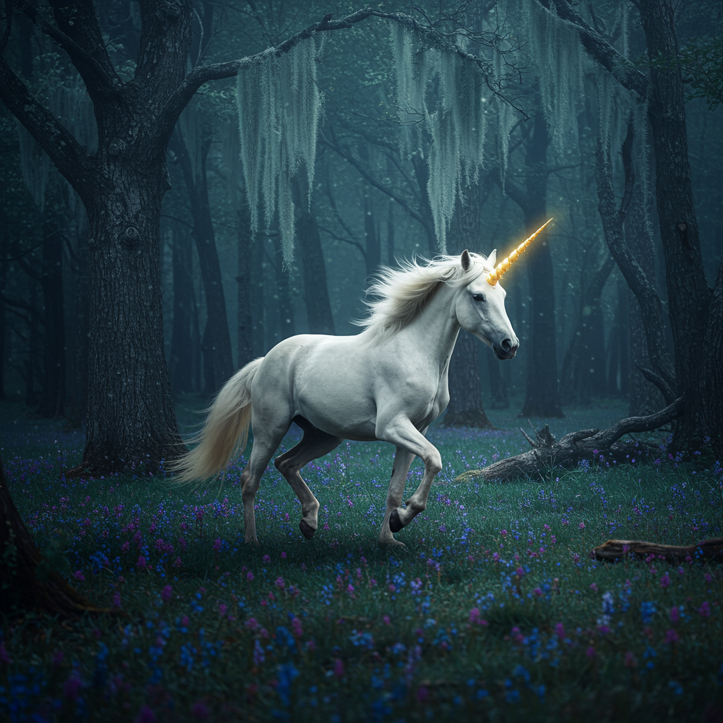 A majestic unicorn gallops through the enchanted forest, its horn shimmering in royal gold under the moonlight.