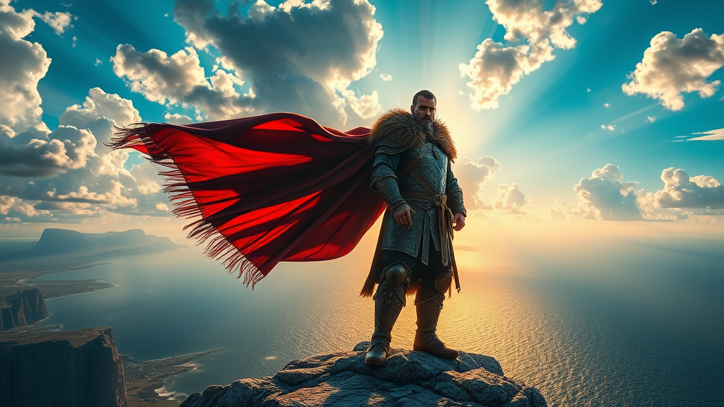 A majestic Viking king stands proudly atop a rocky cliff, his flowing cape caught in the wind, photorealistic and vivid with bright colors illuminating his adorned armor. The scene is dynamic and ultra-detailed, with cinematic lighting casting bold shadows. Volumetric rays of sunlight pierce through the clouds, enhancing the high dynamic range of the landscape, with the vast ocean sprawling behind him. His piercing gaze looks into the distance, embodying strength and leadership amidst the backdrop of a vibrant and dramatic sky.