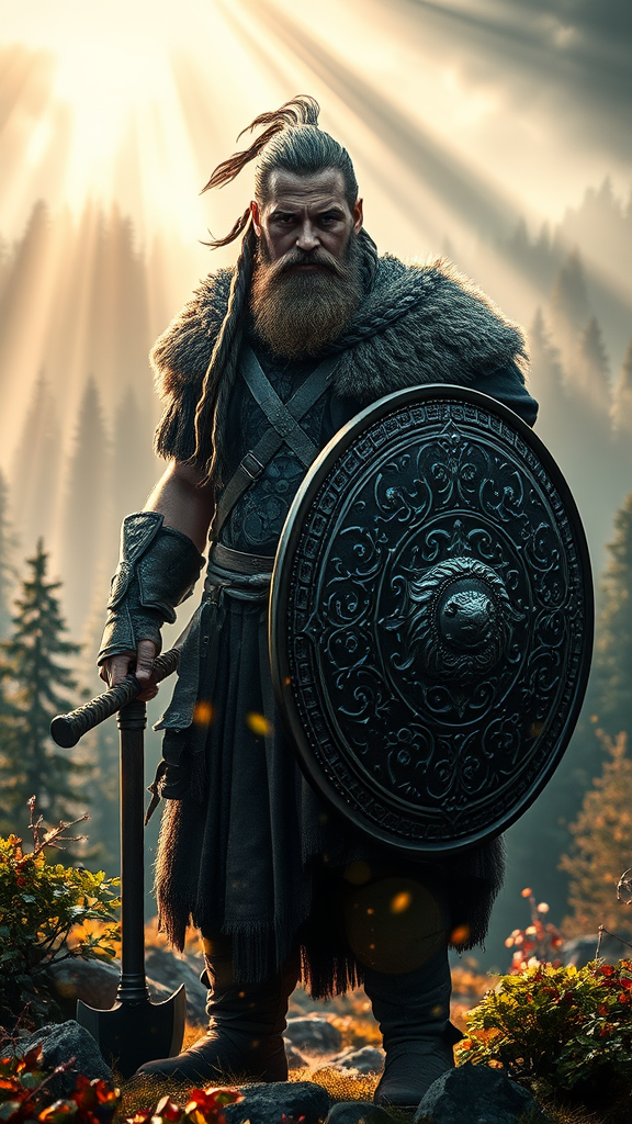 A majestic Viking warrior standing resolutely amidst a breathtaking landscape, illuminated by ethereal fairy lights that dance around him. The scene is captured in photorealistic detail, with dynamic movement in the warrior's flowing cloak and braided hair. Volumetric rays of sunlight pierce through the misty forest, casting an otherworldly glow over the intricate engravings on his shield and axe. The entire scene is brought to life in vivid HDR, accentuating every nuance and shadow in this captivating portrait, framed in an epic 9:16 aspect ratio.