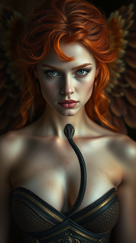A majestic warrior goddess with an angelic face and fiery red hair stands confidently. Her mouth slightly open reveals a serpent emerging, adding an enigmatic allure to her expressive, large eyes. The portrait captures her full figure, showcasing her smooth and flawless complexion. The scene is imbued with a sense of magical realism, enhanced by dramatic lighting that highlights her presence. This intimate cinematic portrait is presented with gentle contrast in a vertical composition.