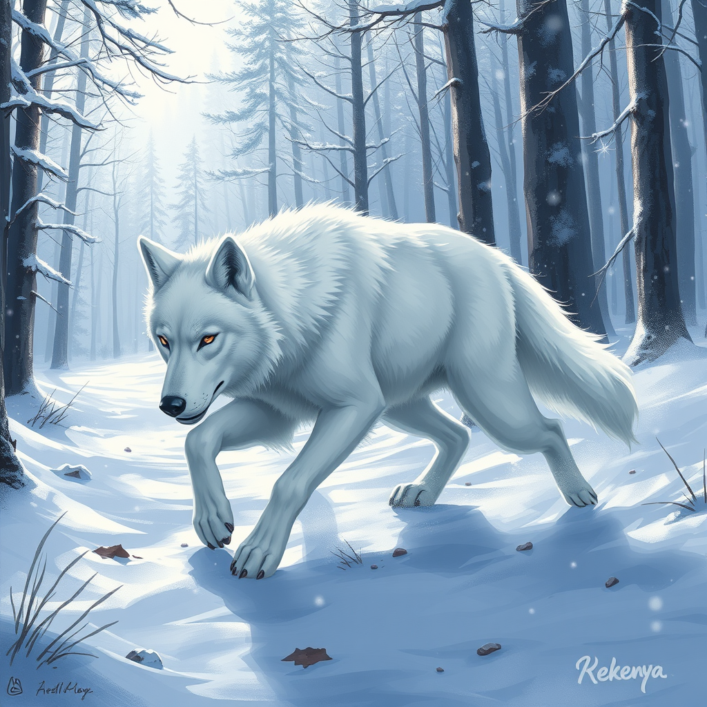 A majestic white wolf prowls through a serene snowy forest, its luminous fur blending with the landscape, creating a striking portrait in a dynamic anime-inspired style. As it moves gracefully, the forest comes alive around it; snowflakes dance through the crisp air, and the trees stand tall, laden with snow. This 2D painting captures the essence of the beast in a full-body depiction, set against an expressive, dynamic backdrop that highlights the wilderness's tranquility and the wolf's untamed spirit.