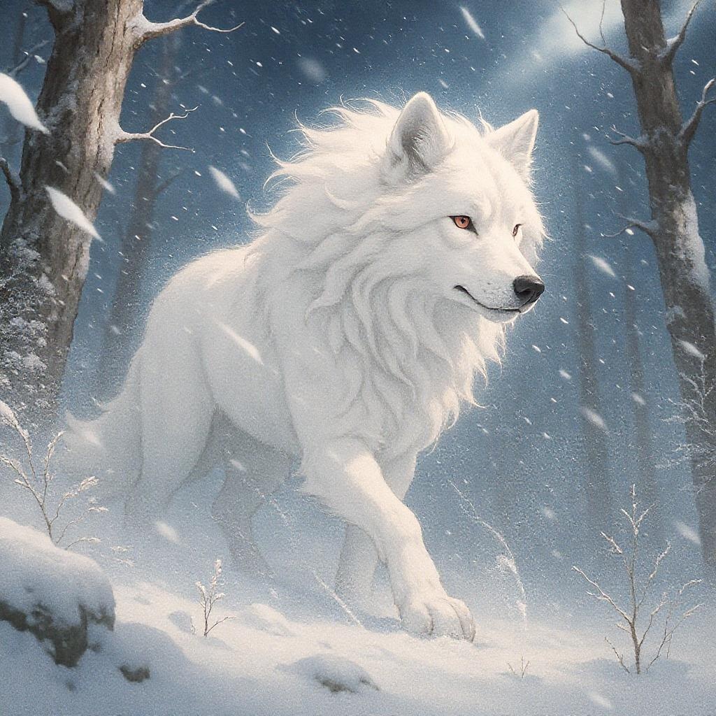 A majestic white wolf stands poised in a snow-covered forest, framed by towering trees and gentle snowfall. The scene unfolds in an evocative style reminiscent of anime, where the wolf's fur contrasts against the winter backdrop, capturing a sense of motion and vitality. The composition highlights the dynamic interplay between the wolf's animated pose and the swirling snowflakes, creating a vivid portrait that blends expressive artistry and a touch of magic.