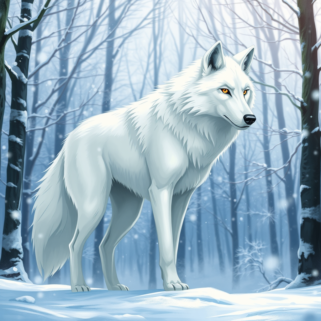 A majestic white wolf stands poised in a snowy forest, its sleek fur blending seamlessly with the wintry landscape. The setting is a serene, enchanted woodland, the trees dusted with fresh snow and the air crisp and clear. This concept art captures the essence of anime with a 2D painting style, focusing on a portrait that encompasses the entire body of the wolf in a dynamic pose. The background is alive with swirling snowfall, adding movement and depth to the scene. The expressive style emphasizes the wolf's piercing eyes and elegant form, evoking a sense of wild grace and mystique.