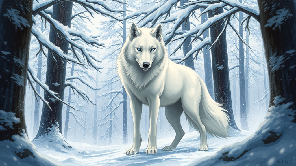 A majestic white wolf stands proudly in a snowy forest, surrounded by towering, snow-covered trees. In this concept art, the anime-style painting captures the wolf in a dynamic pose, exuding both strength and grace. The background, full of movement, swirls with the wind blowing through the branches, adding a sense of energy to the scene. The expressive quality of the artwork emphasizes the wolf's piercing blue eyes and sleek fur, creating a captivating portrait that tells a story. The tall trees, laden with snow, frame the wolf's full body, adding depth and contrast to the scene.