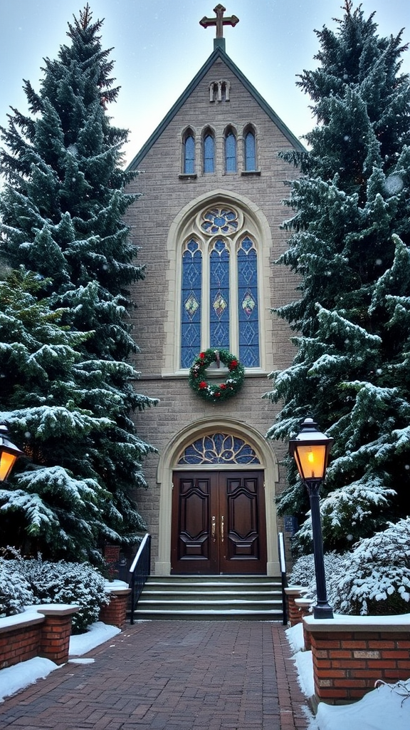 A majestic winter scene unfolds, showcasing the historic exterior of Kirk in the Hills Presbyterian Church in Bloomfield Hills, MI. The grand stone structure, adorned with elegant stained glass windows, stands majestically amidst gently falling snowflakes. Towering evergreens, dusted with a pristine layer of snow, frame the church, adding a touch of enchanted serenity. Twinkling lights wrap around the trees and illuminate the church facade, casting a warm, inviting glow. In the foreground, a vintage street lamp softly lights the cobblestone path leading to the entrance, where a beautifully crafted wreath adorns the heavy oak doors. The scene captures a harmonious blend of rustic charm and luxurious elegance, embodying the spirit of Christmas with grace and warmth.