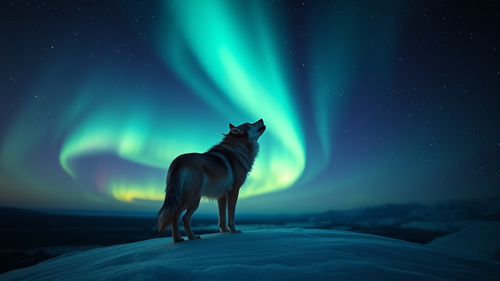 A majestic wolf stands poised on a snowy hill, silhouetted against the ethereal glow of the aurora borealis that dances across the night sky. Its gleaming fur catches the soft illumination of the celestial display, and its piercing eyes gaze into the horizon. Stars twinkle like diamonds scattered across a velvet canvas, enhancing the serene yet powerful atmosphere. The scene captures a hyper-realistic, photo-like quality, using a 65mm lens and a long exposure to accentuate the magical interplay of light and shadow. The wolf's howl seems to echo into the vast expanse, merging with the gentle whispers of the wind.