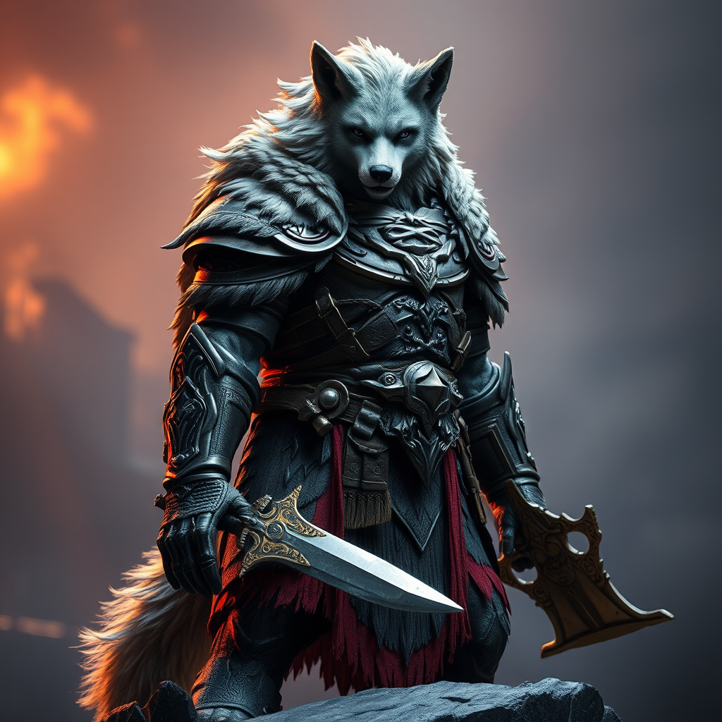 A majestic wolf warrior character stands poised, embodying the spirit of an anthropomorphic hero in a high-fantasy realm, ideal for a Dungeons & Dragons campaign. The figure exhibits masterful craftsmanship and realistic anatomy, with precise details enhancing its powerful presence. The hyper-detailed fur and intricate armor glisten under dramatic, cinematic lighting, evoking the realism of a high-definition photograph. Set against an epic backdrop, the scene captures the essence of a battle-hardened leader, every nuance meticulously rendered in stunning 32k UHD quality, maintaining a striking 9:16 aspect ratio for a grandiose visual impact.