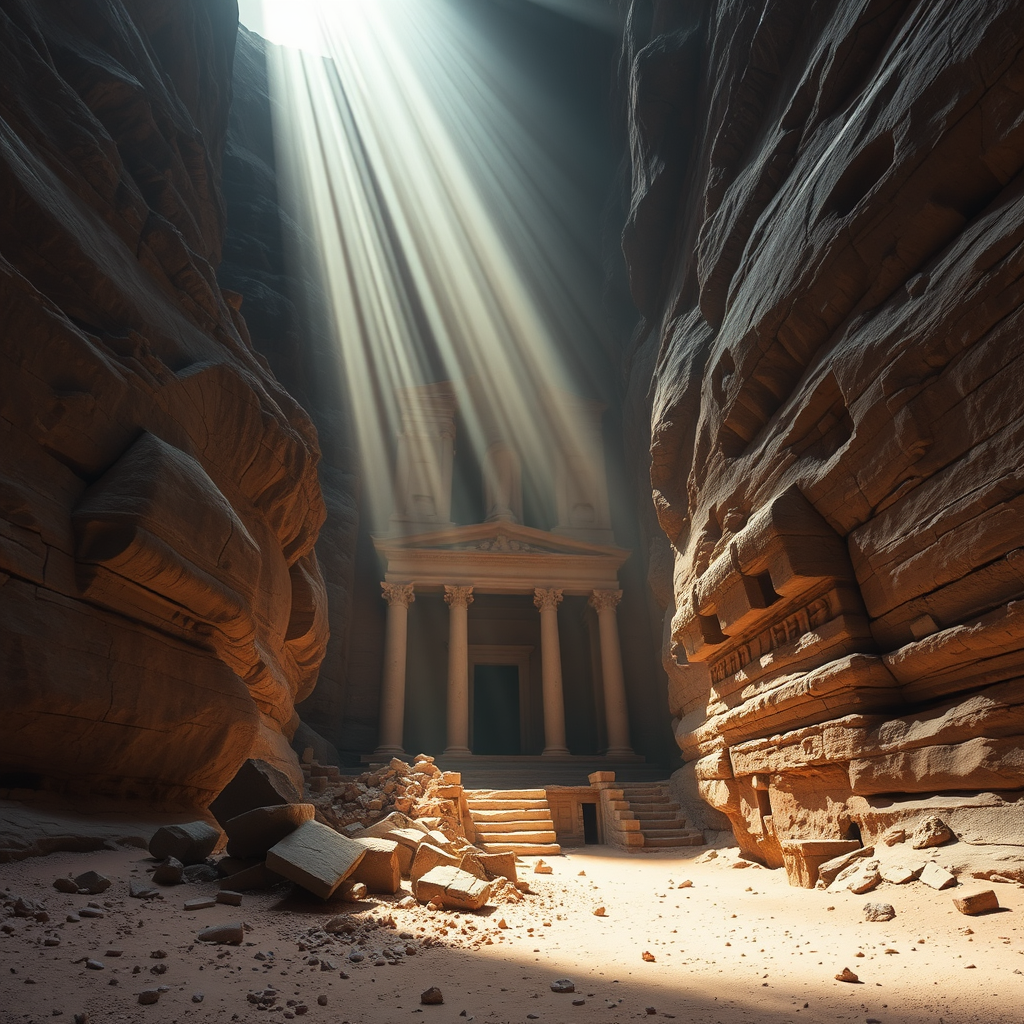 A majestic yet ruined Sumerian temple, partially hidden within the towering walls of a canyon, surrounded by scattered debris near its ancient entrance. The arid desert landscape envelops the scene, while a dark canyon contrasts with striking light rays filtering down from above, reminiscent of the iconic 'Petra' architecture. The cinematic scene is enhanced by breathtaking volumetric lighting, captured in crystal clear 16k UHD with HDR quality. The atmosphere is imbued with an air of mystery and history, as the weathered stones of the temple tell tales of a long-lost civilization. The setting is devoid of any modern artifacts or distractions, allowing viewers to fully immerse themselves in the visual splendor and timeless beauty of this hidden wonder.