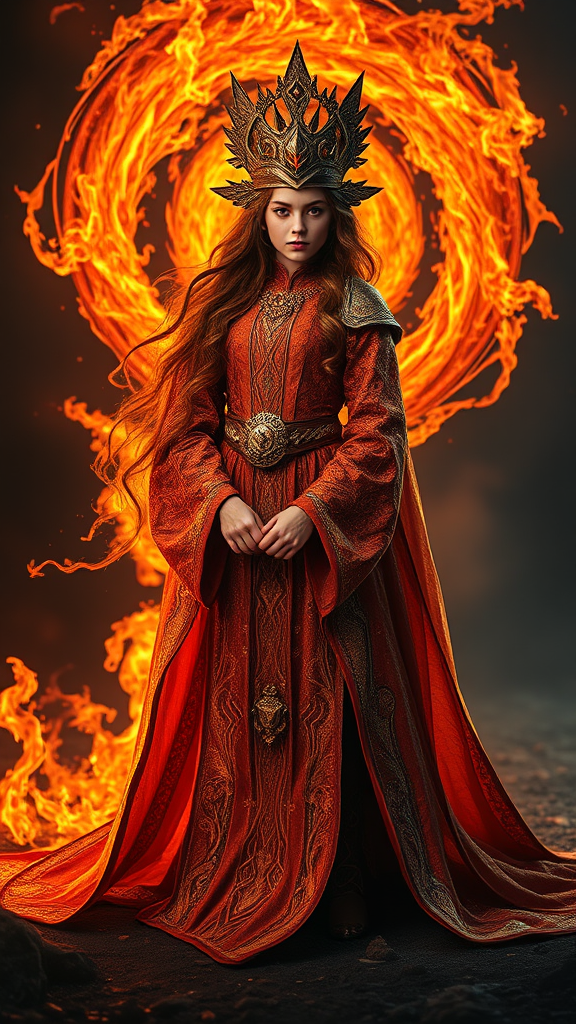 A majestic young queen of fire stands gracefully on the ground as spiral flames swirl in the background, exuding an aura of glory. Her full-body presence is adorned with intricate, regal clothing that shimmers with the hues of ember and gold. Her perfect, ethereal face is framed by locks that mimic the flicker of flames, and her elegant pose commands respect. The composition is a flawless blend of realism and fantasy, with elements of circuit board patterns interwoven subtly into her attire. The scene is a striking piece of fantasy art, reminiscent of an ArtStation masterpiece, set in a trial dark fantasy world. Intense shadows and dramatic lighting amplify her fiery majesty. This photorealistic concept art is rendered in ultra-detailed quality at 8k resolution, with sharp focus and HDR effects. The high-definition imagery creates an ideal wallpaper that captures the high quality and stylized intensity of a 1000-level render, perfectly framed with an aspect ratio of 2:3.