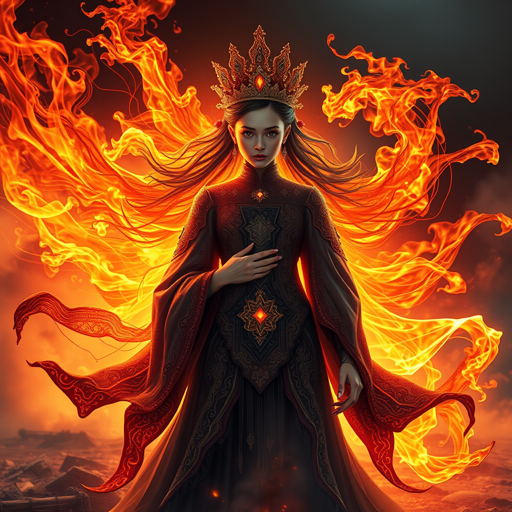 A majestic young Queen of Fire stands regally on the ground enveloped by a swirling flame fog, her presence both powerful and mesmerizing. She wears elaborately designed garments that flow elegantly around her, each detail echoing the intricacy of a masterfully crafted circuit board. Her face is a vision of perfection and beauty, embodying elegance and strength in a single gaze. The scene is a seamless blend of fantasy and realism, captured in an illustration reminiscent of dark fantasy tales. Intense shadows and dramatic lighting enhance the atmosphere, adding depth and intensity to the composition. The image is rendered in ultra-detailed 8k resolution with 3D octane quality, ensuring a sharp focus that makes it suitable for high-definition wallpaper. The overall quality is nothing short of high-definition and stylized to perfection, a stunning portrayal that marries technology with fantasy, capturing the essence of an artful and photorealistic concept.