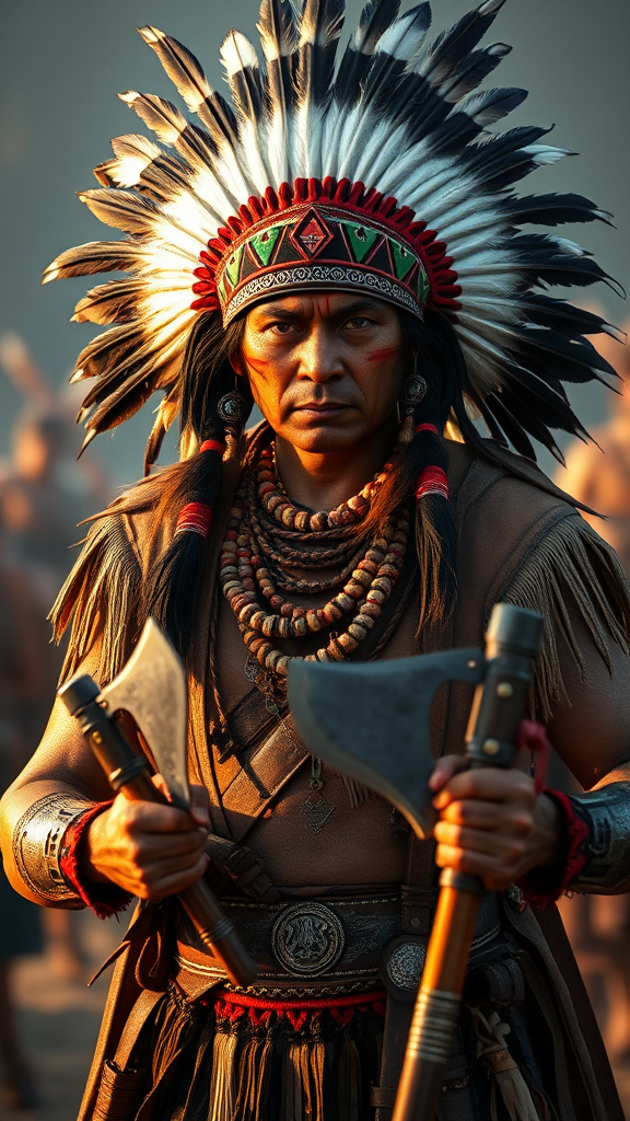 A male Apache warrior stands resolute, fierce in expression, with a war bonnet headdress adorned with feathers catching the light. His face is intricately painted, and he wields dual axes, poised for battle. The warrior's attire is a masterpiece of Native American craftsmanship, rich with ornate patterns and vibrant colors. Captured with stunning high-definition detail, the scene unfolds with cinematic lighting that highlights the drama of the battleground environment. Shadows play naturally over the warrior's form, while subtle illumination enhances the textures of his rugged skin and the intricate fabric of his clothing. Utilizing the power of Unreal Engine 5, the scene achieves photorealism through masterful ray tracing and octane rendering, offering a breathtaking view in 8K resolution. The depth of field draws focus to the warrior, while the background subtly fades, adding to the cinematic quality of the scene. The use of VFX post-production and RTX lighting further elevates this visual spectacle to an epic portrayal of valor and strength.
