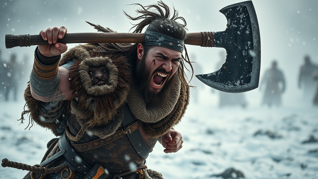 A male barbarian charges into battle with a powerful battle-axe, letting out a fierce battle-cry that echoes across the snowy battlefield. His face is etched with a fierce expression, and his handcrafted cloth outfit is intricately detailed. War paint streaks across his face, adding to his warrior persona. The battlefield is captured in dramatic cinematic lighting, with snow gently falling around him. This scene is rendered in hyper-photorealistic detail, utilizing Unreal Engine 5 and RTX ray tracing technology for an exceptionally lifelike image. The concept art feels dynamic, immersing viewers in the action, with a subtle watermark unobtrusively included. The image maintains realism without depicting missing limbs, focusing instead on the raw energy and intensity of the moment.
