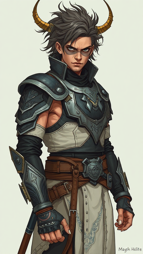 A male character design inspired by the surreal world of Krull, blending the intricate line work and dynamic compositions of Sergio Toppi with the elegance and sophistication of George Barbier. The character embodies sci-fi motifs with hyperrealistic details, reflecting elements of futuristic armor and celestial patterns. The design captures the essence of rebelcore through rugged textures and a defiant expression, all rendered in a minimalist yet photo-realistic style. His attire merges the avant-garde with hints of medieval influence, embodying both timeless and otherworldly qualities, while maintaining a raw aesthetic.