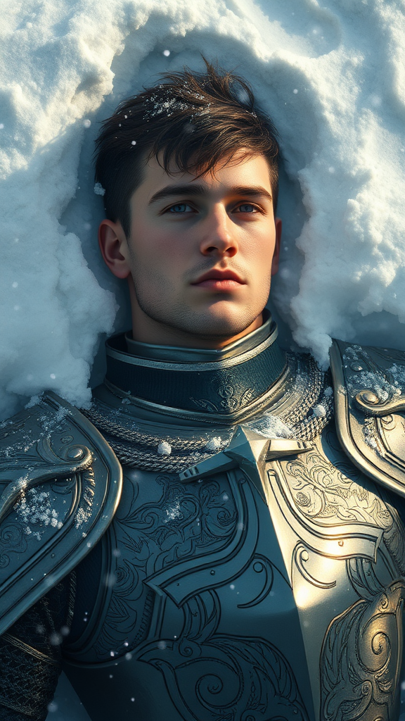 A male figure lies peacefully in the snow, a noble knight reminiscent of Sturm from Dragonlance, exuding an aura of honor and contemplation amidst the wintry expanse. His armor glistens subtly under the soft, diffused light, revealing intricate details and craftsmanship. The serene landscape surrounds him, with snowflakes delicately falling. His face is a masterpiece of detail, capturing a thoughtful expression with lifelike eyes that tell silent tales of valor. The scene is crafted with remarkable quality and photorealism, marked by the artistic influences of Jeremy Mann, Sandra Chevrier, and Maciej Kuciara, featuring sharp realism and authentic shadows, giving the impression of a three-dimensional presence. The work ensures a high level of realism with no aberrations like extra limbs or cartoonish features, focusing solely on the harmonious integration of man and nature.