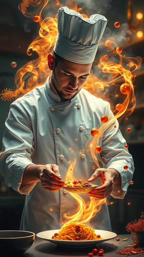 A male French chef, recognized as the most talented chef in the world, enveloped in an aura of culinary magic, depicted in fantasy art style by Greg Rutkowski, Loish, Rhads, Ferdinand Knab, Makoto Shinkai, Lois van Baarle, Ilya Kuvshinov, RossDraws, and Tom Bagshaw. The image captures sharp focus, smooth lines, and perfect symmetry, with creative elements such as ethereal ingredients swirling around him, vibrant and glowing, as his hands craft an extraordinary dish with effortless grace. The ambiance blends whimsical fantasy with masterful technique, showcasing the chef's unparalleled expertise and enchanting presence.