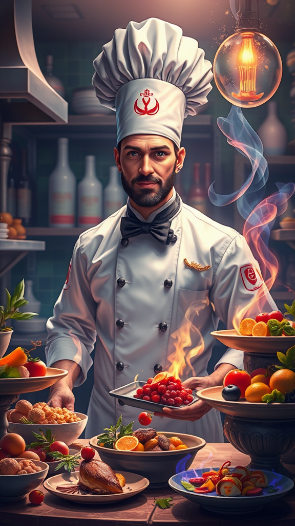 A male French chef, the most talented and celebrated culinary master in the world, adorned with an aura of magical artistry. The scene is alive with elements of fantasy art, intricately detailed and rich in color. Inspired by the styles of Greg Rutkowski, Loish, Rhads, Ferdinand Knab, Makoto Shinkai, Lois van Baarle, Ilya Kuvshinov, Rossdraws, and Tom Bagshaw, the artwork features sharp focus, smooth textures, and perfect symmetry. The chef stands at the center of a dreamlike kitchen, where each dish comes to life with enchanting animations and vibrant hues, blending reality with fantasy in a harmonious culinary dance.