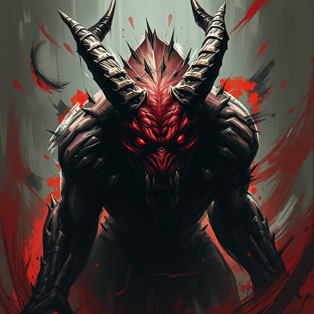A male horrific demon emerges from the shadows, its monstrous form captured in an explosion of chaotic brush strokes reminiscent of late 20th-century concept art. The creature towers with an imposing presence, its grotesque features meticulously detailed to showcase every sinew and texture of its otherworldly skin. Jagged horns twist upwards, and its eyes glow with a malevolent intensity, casting a sinister light across its snarling face. The dynamic composition swirls around the demon, evoking a sense of relentless movement and drama, as though it is perpetually surging forward from the depths of darkness. The high contrast of the piece highlights every dark crevice and sharp edge, while a primarily crimson and midnight color palette adds a visceral intensity to the scene, capturing the viewer's attention and immersing them in a realm of dread and fascination.