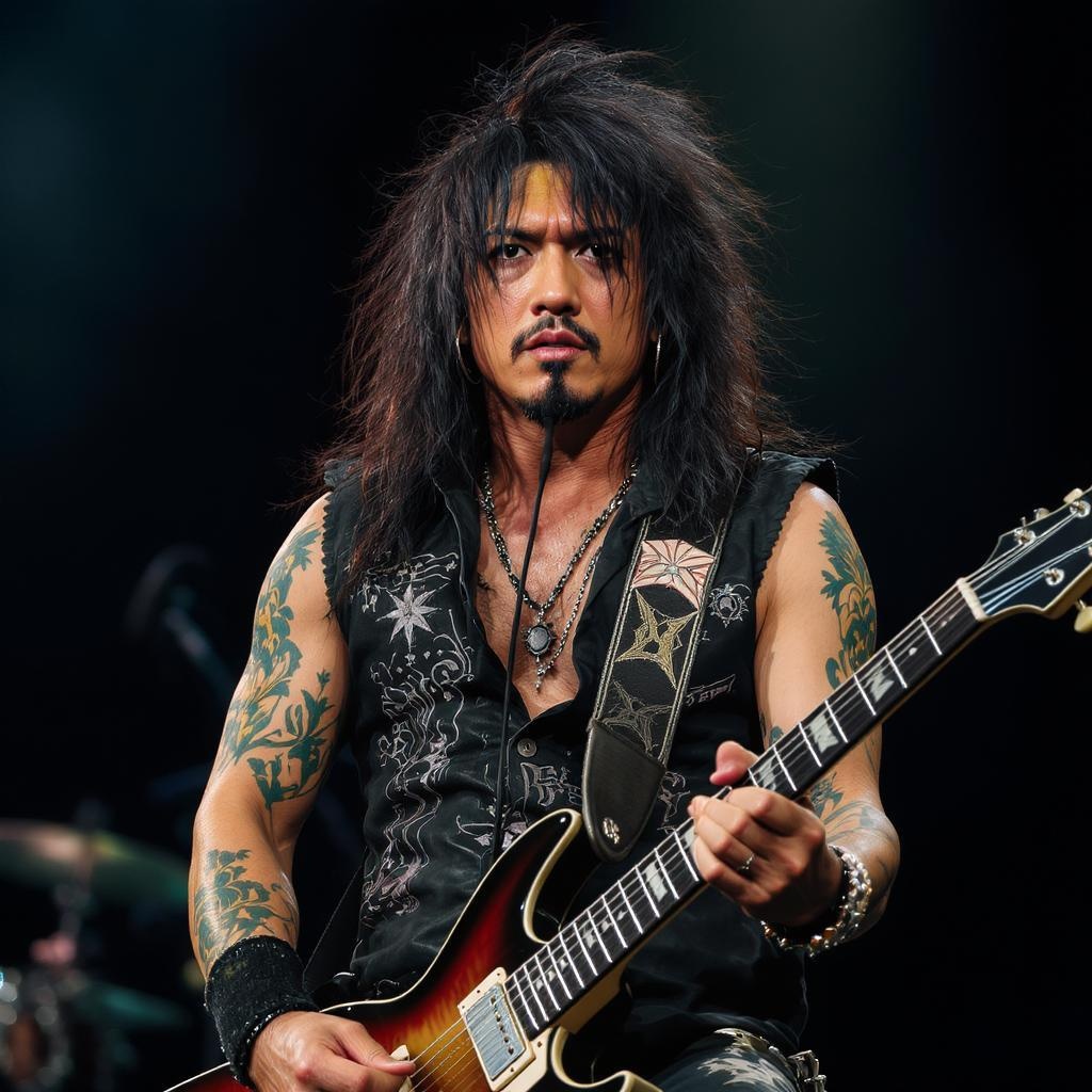 A male Japanese rockstar stands confidently on stage, gripping an electric guitar. He has long, wild hair and intricately detailed tattoos. The scene is captured in a photo-realistic style, featuring cinematic lighting that highlights his intense expression. His skin appears textured and lifelike, enhanced by diffused soft lighting and a touch of cinematic noise. The image is sharp and focused, with a shallow depth of field that blurs the background, while strong, real shadows add depth. Captured in 8k resolution, the photograph emphasizes the details of his performance.