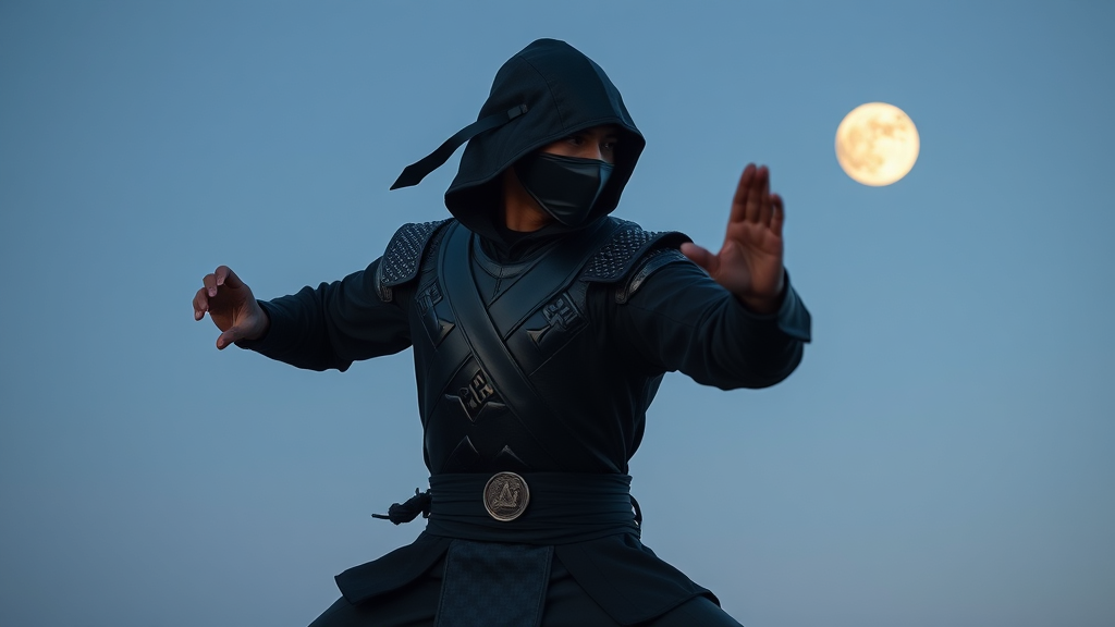A male ninja encased in sleek, full-body armor listens to the soft strains of classical music through wireless earbuds as he gracefully performs tai chi under the soft glow of moonlight, melding ancient martial arts with a serene, modern twist.
