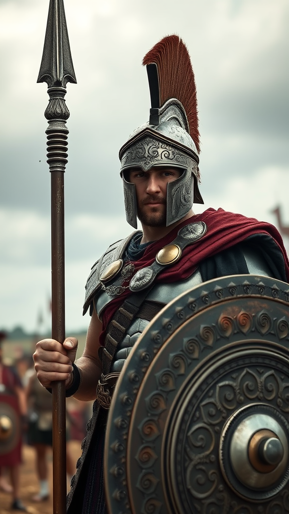 A male Spartan warrior stands confidently on a battle ground, facing the camera with a determined gaze. His finely detailed helmet and armor gleam with intricate designs, showcasing unparalleled craftsmanship. The spear he holds is both elegant and formidable, while the shield displays elaborate patterns that speak of ancient traditions. The scene is rendered in ultra-realistic quality with cinematic lighting that captures every nuance of his features. The overcast sky casts a soft, diffused light, creating dramatic reflections and shadows. The focus is sharp, with an 8k resolution ensuring every detail is meticulously captured. Using RTX ray tracing lighting and VFX post-production techniques, the image achieves movie-quality rendering, offering a vivid and immersive representation of the warrior's world.