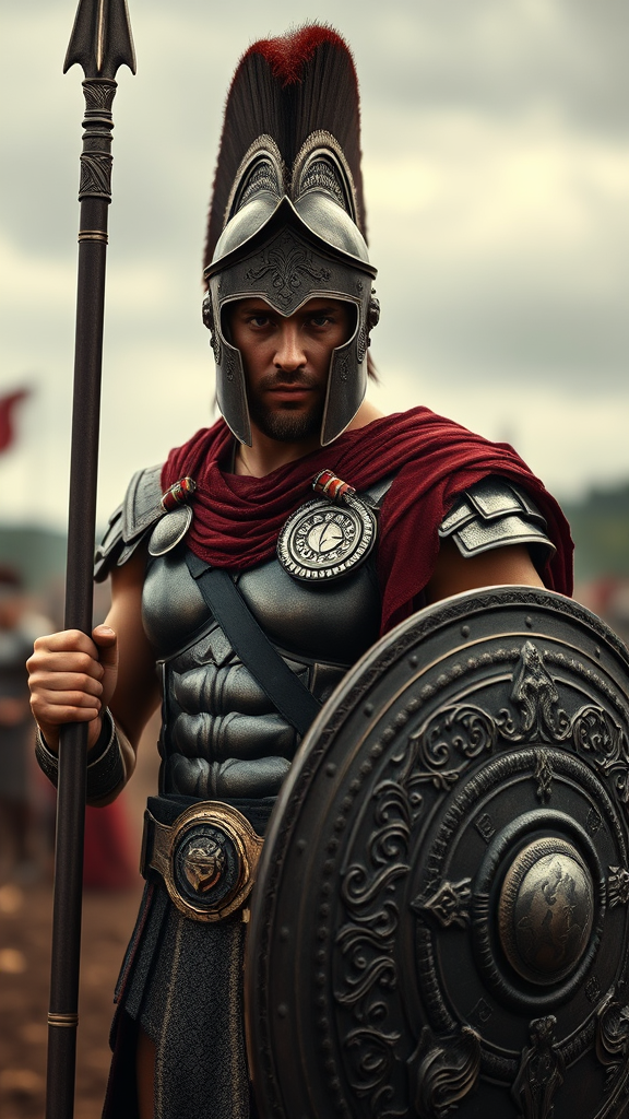 A male Spartan warrior stands on a battlefield, facing the camera with fierce intensity. His finely detailed helm catches the light, revealing intricate carvings that speak of ancient tales and valor. The armor is a masterpiece of craftsmanship, adorned with delicate etchings and symbols of power. In one hand, he holds a formidable spear, its polished surface reflecting the somber tones of the overcast sky. His shield, an emblem of strength, is etched with complex designs that tell a story of battles fought and won. The scene is captured in ultra-realistic detail, with photography lighting that highlights the textures and depth of his gear. The overcast reflection mapping adds a dramatic tone, while cinematic, movie-quality rendering brings the warrior to life in 8K resolution. The background is blurred, creating a depth of field that focuses all attention on the warrior at the center. Real shadows and VFX post-production elements enhance the realism, with RTX ray tracing lighting adding a final touch of authenticity to this vivid portrayal of ancient heroism.