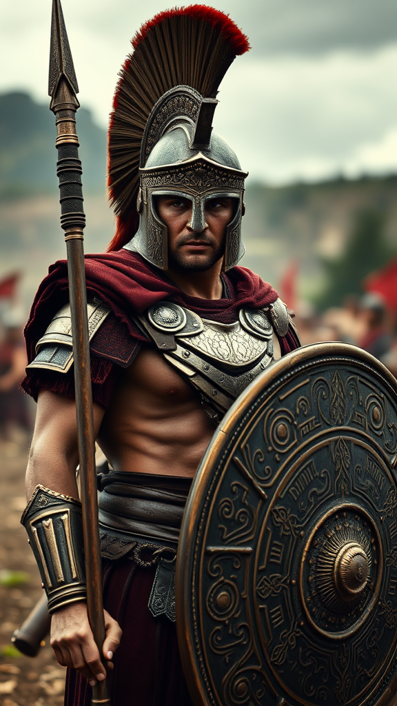 A male Spartan warrior stands on a battleground, facing the camera with intense focus. He wears a finely detailed helm and intricately designed armor, holding a spear and shield adorned with elaborate patterns. The scene is captured in ultra-realistic detail, with cinematic, movie-quality rendering. The atmosphere is enhanced by a diffused overcast light, highlighting the warrior's features through photorealistic depth of field and real shadow effects. The image has undergone VFX post-production, showcasing RTX ray tracing lighting for added realism. The composition is set in an 8k resolution, offering extraordinary clarity and intricacy.
