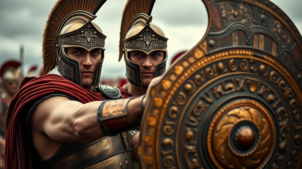 A male Spartan warrior stands poised on a war-torn battlefield, his gaze fixed on the camera with unwavering determination. His helm is ornately crafted, highlighting intricate engravings that tell storied sagas of old battles. The bronze armor hugs his chiseled form, each segment displaying meticulous artistry. He grips a spear firmly, poised to strike, while his shield, emblazoned with ancient symbols, gleams with unparalleled craftsmanship. The scene captures staggering detail, achieving an ultra-realistic quality with sophisticated photography lighting that emphasizes shadows and reflections with RTX ray tracing accuracy. An overcast sky blankets the atmosphere, enhancing the textures and depth of each element. This cinematic composition, rendered in high-definition 8k, benefits from expert VFX post-production and octane rendering, resulting in a dramatic depth of field and striking realism that echoes the anticipation of impending combat in every pixel.