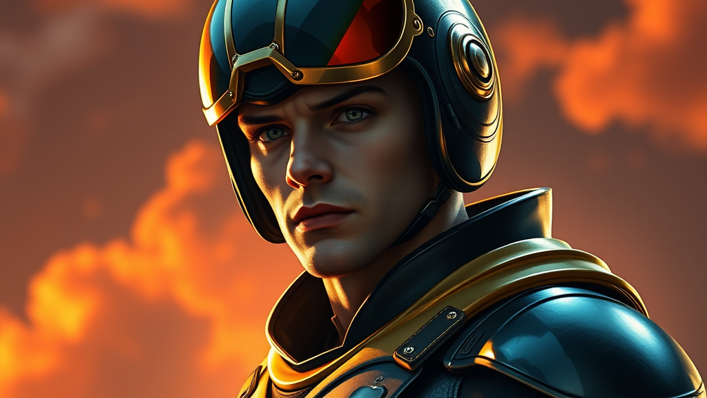 A male superhero stands tall in a sleek Rocketeer-inspired outfit, adorned with fine details that emphasize its classic aerodynamic design. His helmet gleams under the cinematic lighting, capturing the essence of the iconic Rocketeer look. The face beneath is meticulously detailed, showcasing expressive eyes that reflect determination and courage. His physique is athletic and fit, exuding the strength and agility of a seasoned hero. The full body portrait is depicted in stunning 8k resolution, a masterpiece concept art that embodies the styles of Greg Rutkowski, Artgerm, WLOP, and Alphonse Mucha. The artwork features hyperdetailed and intricately crafted elements, highlighted by a dynamic and balanced triadic color palette. Splash art qualities infuse the piece with energy and movement, making it a standout on platforms like Artstation. The scene is bathed in a blend of warm and cool tones, accentuating the hero's vibrant presence against a dramatic backdrop. This composition merges classic superhero elements with a fresh, artistic twist, creating a visually captivating narrative.