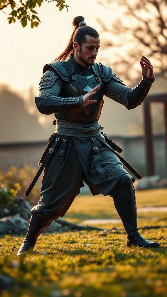 A male warrior clad in sleek, full-body armor designed with intricate details moves gracefully across a secluded garden as dawn breaks. His eyes are focused and serene, while wireless earbuds quietly play a symphony by Beethoven. Oblivious to the world around him, he performs the flowing movements of tai chi, each motion synchronized with the rise and fall of the music. The gentle rustle of leaves and the distant sound of a running stream accompany the melodies, creating a harmonious blend of nature and art. His presence is a blend of ancient discipline and modern technology, embodying the perfect balance between strength and tranquility.