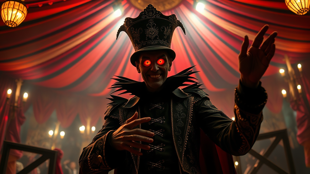 A malevolent and maniacal ringmaster orchestrates a menacing and eerie circus of nightmares, his eyes gleaming with wicked delight as he captivates the audience with a spectacle of the macabre. The circus tent, lavishly adorned with intricate designs and chilling details, serves as a backdrop to this dark carnival. Shadows dance and flicker under dramatic, ethereal lighting, casting an otherworldly glow over the unsettling performers. Each act pushes the boundaries of horror, blending the bizarre with the breathtaking in a photorealistic and cinematic display. The atmosphere is charged with a sinister allure as the show unfolds in high-definition 8k quality, drawing viewers into its haunting embrace.