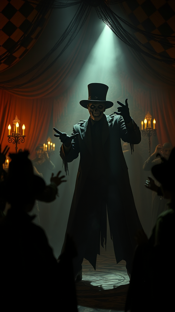 A malevolent and unhinged master showman orchestrates a macabre and eerie circus spectacle, where shadows dance around sinister performers and grotesque acts unfold. The atmosphere is steeped in horror and darkness, with intricate designs woven into every corner. Dramatic lighting casts haunting silhouettes across the scene, creating a photorealistic and cinematic experience that feels otherworldly. The detail captures every twisted smile and chilling gaze in stunning 8k clarity, drawing the audience into a realm of nightmarish wonder.