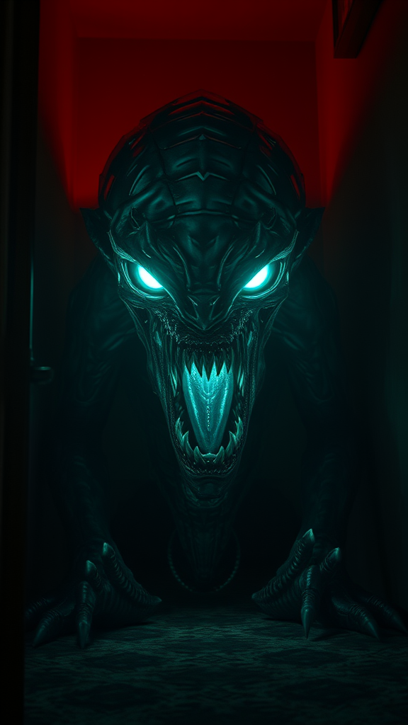 A malevolent extraterrestrial entity with luminescent neon eyes crouches menacingly in the corner of a dimly lit room. Its guttural roars reverberate through the shadows as its maw, overflowing with saliva, reveals rows of dagger-like fangs. Exuding an aura of unspeakable evil, the creature's translucent form is both haunting and mesmerizing, embodying the very essence of horror. Its intricate, dark design is brought to life by dramatic, cinematic lighting, capturing every unsettling detail in stunning, photorealistic clarity. The scene is rendered in hyper-realistic 8k quality, utilizing the cutting-edge technology of Unreal Engine 5.2 to deliver an epic visual experience that blurs the line between reality and nightmare.