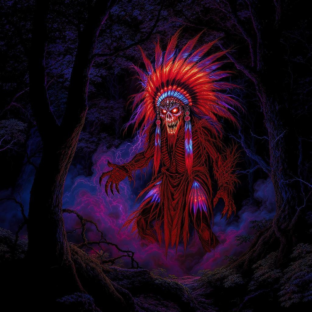 A malevolent Native American spirit lurks deep within the shadowy woods, captured in the eerie style of night photography, with colors so intense they almost burst, resonating with the explosive energy and dramatic flair reminiscent of EC Comics. The scene is alive with vivid, supernatural energy, where the spirit's malevolent aura glows in the dark, casting surreal patterns of light and shadow across the gnarled trees and misty forest floor, painting a tableau of haunting beauty infused with supernatural dread.