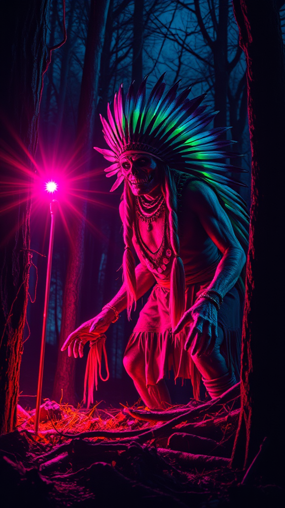 A malevolent Native American spirit lurks ominously in the dark woods, captured in night photography with intense color saturation; vibrant energy bursts illuminate the scene with vivid and dynamic hues, echoing the dramatic flair of EC Comics, as shadows twist and contort in the eerie, supernatural glow.
