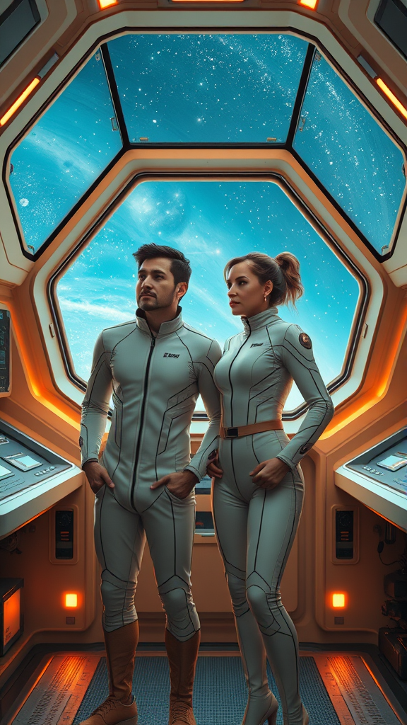 A man and a woman clad in sleek futuristic uniforms stand together inside the high-tech interior of a spaceship, surrounded by advanced control panels and softly illuminated by ambient lighting, the room subtly tinted with shades of orange and beige. Through large, transparent observation windows, the vast expanse of space stretches beyond, dotted with distant stars and swirling nebulae. The couple gazes out thoughtfully, their expressions a mix of awe and determination. The scene is rendered in hyper-realistic detail, capturing the reflective textures of their suits and the intricate design of the spacecraft. This digital masterpiece, set in ultra-high definition, evokes the wonder and sophistication of science fiction.