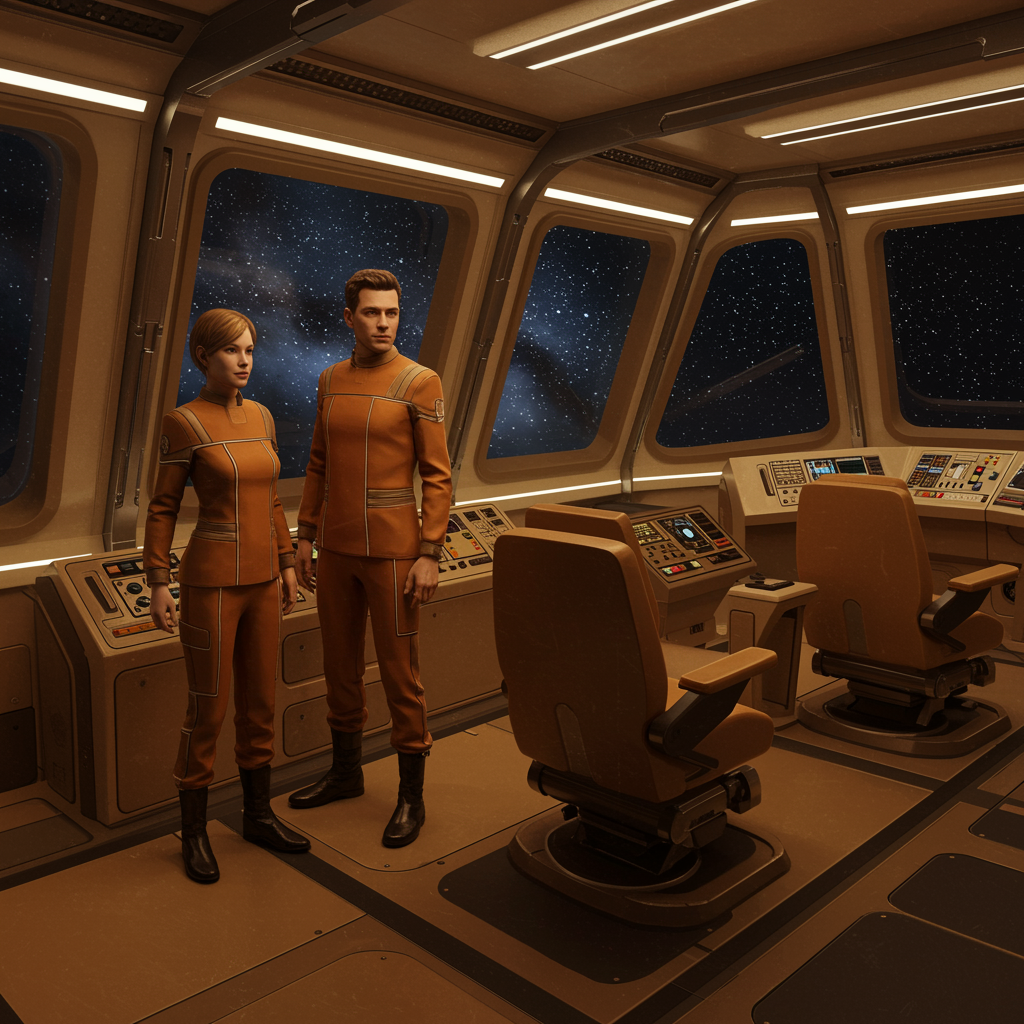 A man and a woman dressed in sleek, futuristic uniforms stand inside the sophisticated interior of a spaceship, surrounded by large windows offering panoramic views of the cosmos. The ship's design is a masterpiece of digital art, with a refined color palette of burnt orange and soft beige that creates a warm, inviting atmosphere. Hyper-realistic details are evident in every aspect, from the intricate textures of the control panels to the subtle reflections on the polished surfaces. The scene is captured in exquisite 32k UHD quality, immersing the viewer in an ultra-detailed, science fiction tableau that exudes a sense of wonder and exploration. The couple's expressions reflect determination and curiosity as they embark on their interstellar journey, embodying the spirit of adventure and discovery.