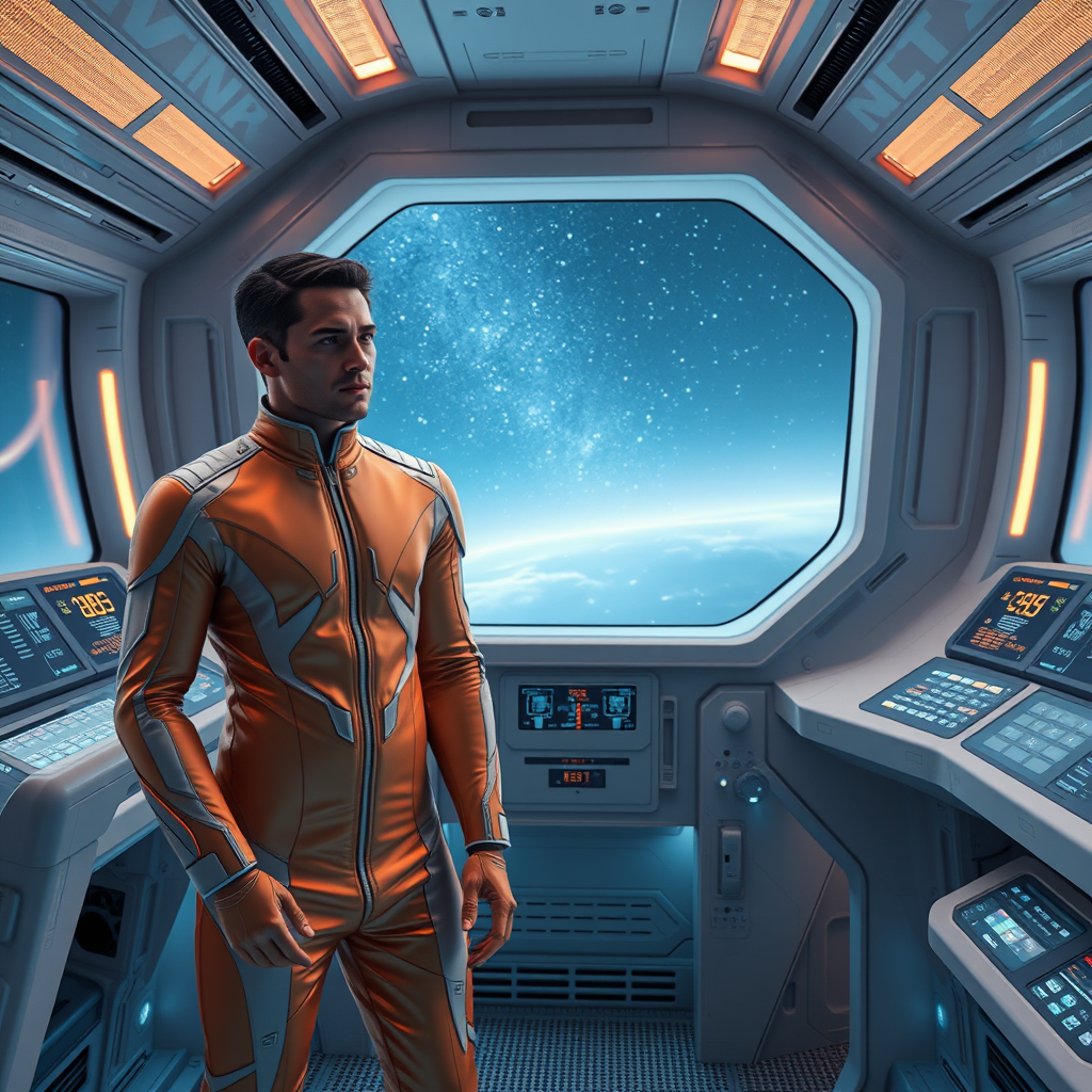 A man and a woman in sleek, futuristic uniforms stand inside a highly advanced spaceship. Their outfits, crafted with a glossy, high-tech fabric, shimmer subtly in hues of orange and beige, reflecting the ambient lighting of the ship's interior. The control panels around them glow softly with dynamic displays, showcasing cutting-edge technology. Large windows offer a breathtaking view of the cosmos outside, where distant stars twinkle in the void. The interior design of the spaceship combines sleek minimalism with intricate detailing, featuring seamless surfaces and flowing lines. The scene is rendered with hyper-realistic precision, capturing every texture and nuance in stunning 32k UHD quality, embodying the essence of a science fiction masterpiece in digital art.