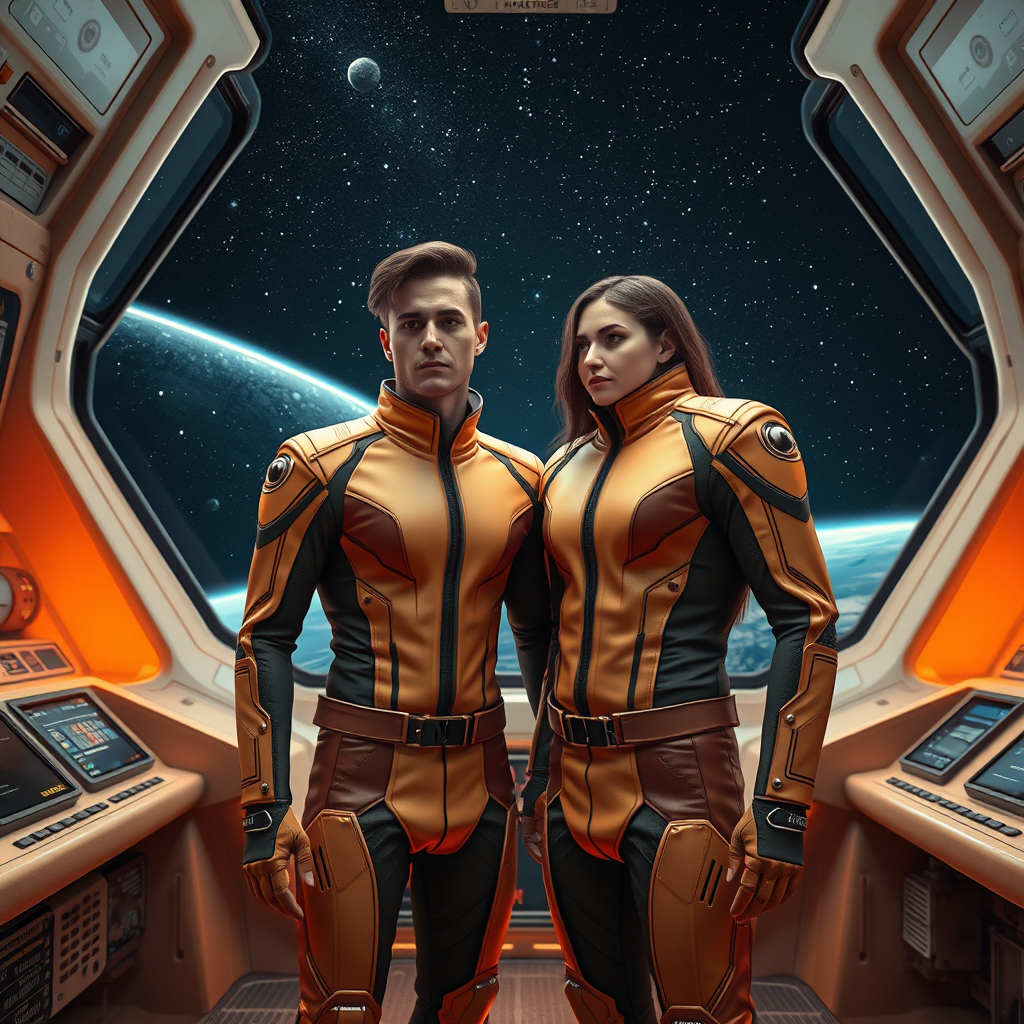 A man and a woman wearing sleek, futuristic uniforms stand together inside the cutting-edge interior of a spacecraft, the walls adorned with advanced technology and control panels. Large windows reveal a breathtaking view of the cosmos, with stars and distant planets visible against the inky blackness of space. The room is bathed in warm hues of orange and beige, casting a soft glow over their meticulously detailed attire. The hyper-realistic rendering captures every nuanced texture and reflection, showcasing the intricate design of the uniforms. This masterpiece of digital art, presented in 32k UHD, embodies the wonder and elegance of science fiction.