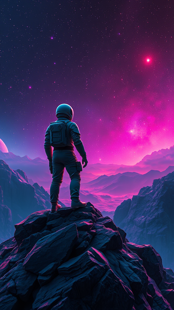 A man clad in a sleek space suit stands confidently atop a rugged hill, gazing into a dark neon-colored expanse that seems to pulse with life. The vibrant, realistic hues of this universe blend seamlessly with the dreamlike quality of interstellar exploration. This digital painting captures the essence of a metal album cover, evoking a sense of wonder and longing for the cosmos. The scene is bathed in dramatic volumetric lighting, enhanced by CGI techniques and rendered with precision akin to Octane. The composition hints at a surreal world, reminiscent of a doll-like perfection, yet retains an organic touch. Despite minor flaws like low resolution, occasional jpeg artifacts, and slightly imperfect anatomy, the artwork’s beauty shines through. With elements slightly cropped or out of frame, it adds an abstract quality that complements the imaginative landscape. The subtle presence of watermarks does not detract from its captivating allure, making this piece an intriguing window into a vibrantly distorted yet fantastical universe.
