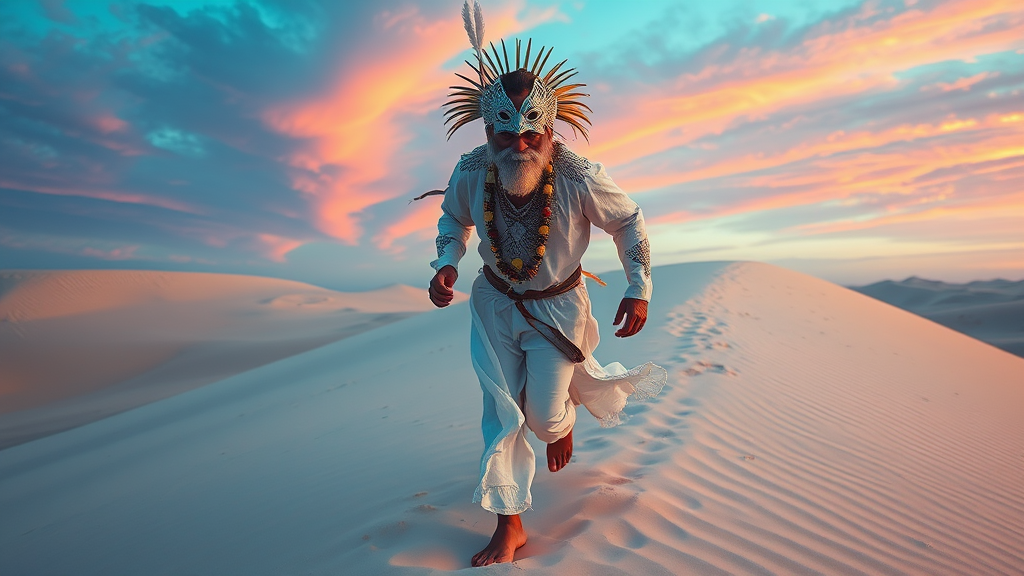 A man dashes across a white sandy dune, gazing intently at the camera. He dons a striking white tribal mask and loose, flowing white garments adorned with intricate tribal patterns. The scene is infused with a dreamy, vivid color palette that exudes a futuristic aura, evoking a sense of animated wonder reminiscent of a Studio Ghibli film. Overhead, the sky shifts with shades of vibrant blues and purples that contrast beautifully with the bright sands below, capturing a moment where tradition meets the fantastical in an otherworldly landscape.