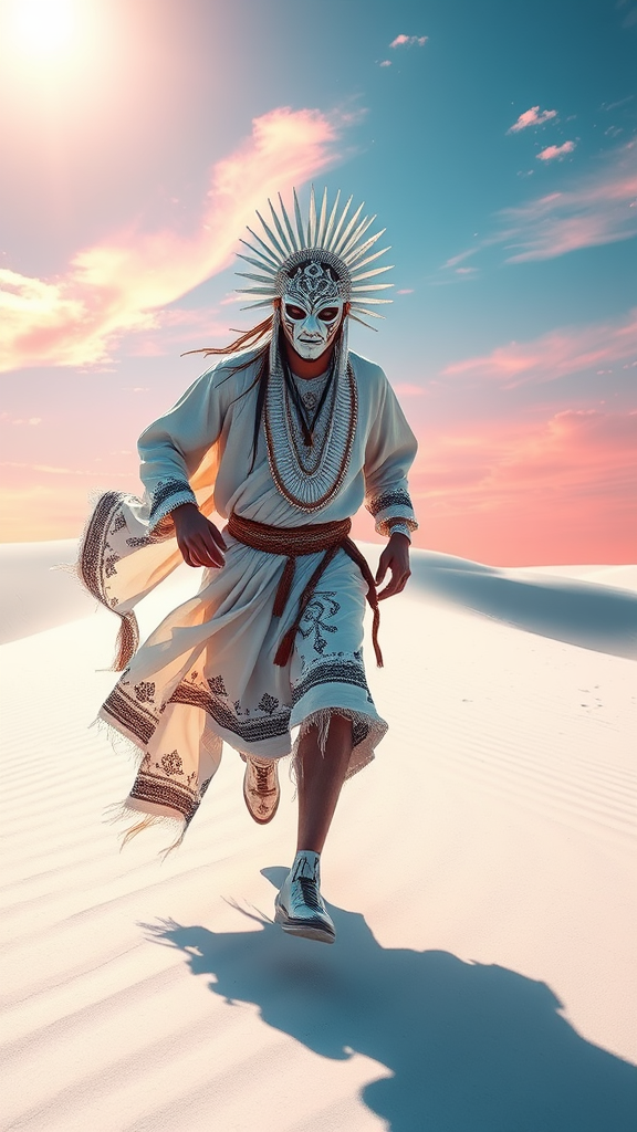 A man dashing across a dazzling, sunlit white sand dune, gazing directly at the camera, adorned in a striking white tribal mask and flowing oversized garments. His attire is embellished with intricate tribal motifs, set against a surreal, vibrant backdrop. The scene is infused with dreamy, bright hues, blending elements of a futuristic aesthetic and anime artistry, reminiscent of a Studio Ghibli masterpiece. The sky above shimmers with ethereal colors, casting an enchanting glow over the dune's pristine surface, adding an otherworldly ambiance to the vibrant tableau.