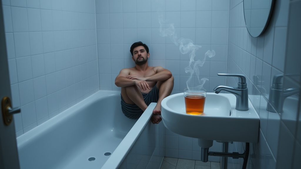 A man idles in a quiet bathroom, perched on the edge of the bathtub, lost in thought as he watches steam rise from the cooling cup of tea balanced precariously on the sink.