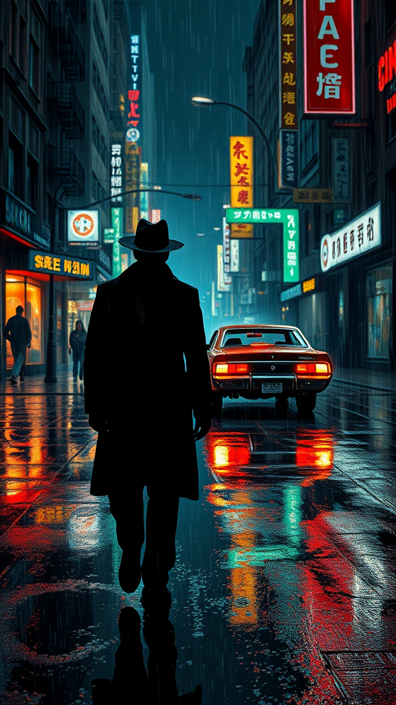 A man in a trench coat and hat walking down a rain-soaked street, illuminated by the harsh neon lights of a cyberpunk cityscape. A weathered car trails behind him, casting distorted reflections on the slick pavement. The scene is painted in the gritty, shadow-filled style of Ben Templesmith, embodying noir elements with a neo-figurative touch. Amidst the visual noise of a bustling city, hints of kitsch and oversaturation seep in, adding layers of complexity to the atmosphere. The imagery captures a sense of distortion and surrealism, as though glimpses of an alternate reality peek through the dim haze. Visual anomalies like grain and blurriness subtly distort the dark, elongated shadows, adding to the enigmatic allure of the landscape. The character’s silhouette merges into the scene, an embodiment of mystery within this futuristic mise-en-scène.
